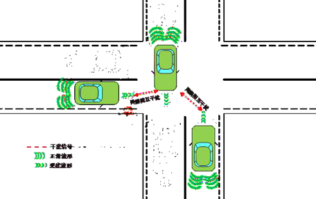 (二)典型干擾場景。汽車雷達產(chǎn)生的無線電信號以調(diào)頻連續(xù)波(FMCW)為主,當同一區(qū)域有多個同頻段汽車雷達工作時,相互間可能產(chǎn)生無線電有害干擾。典型干擾場景有跟車、會車、倒車、變道及十字路口等場景,如圖 2 至圖 6 所示。
